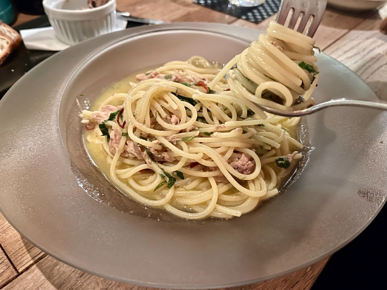 お料理の盛りがよいからお腹もそろそろふくれてきたけれど、どうしても締めはいただきたいのでパスタをチョイス。ツナと大葉のスパゲティ(1000円)を選びました。口に入れた瞬間、大葉のスッキリとさわやかな香りがフワリ!ツナのコク、オイルの旨味と絡み合って思わずどんどん食べ進んでしまいます!この大葉の使い方、最高です!