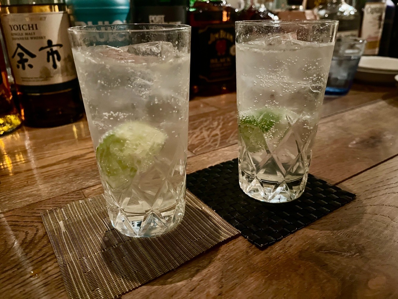 最後はシャキッと、ジンソーダ。ボンベイサファイア(左700円)と、タンカレー(右700円)でキュッと締めました。