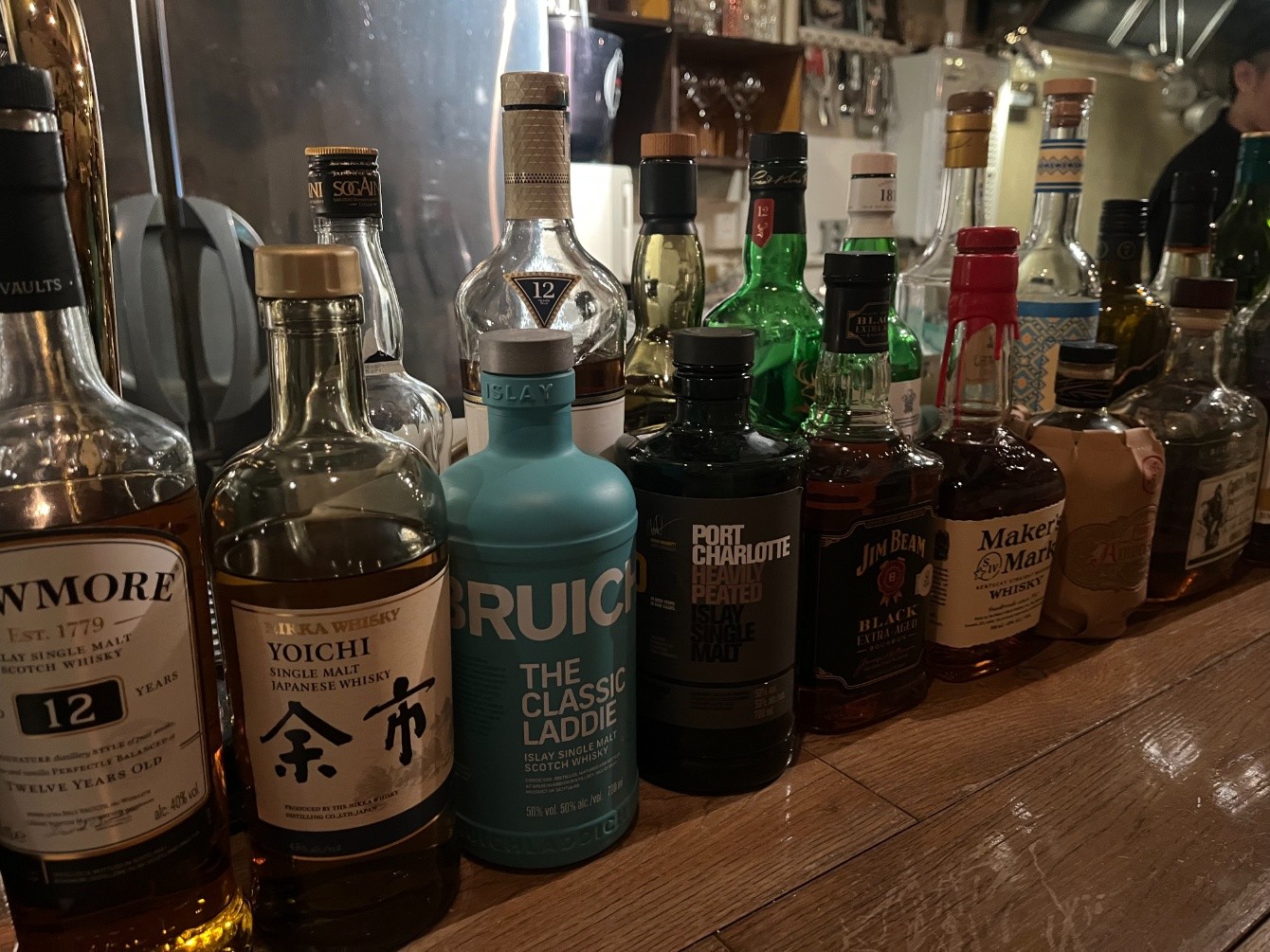 ゆったりと静かなBGMが流れる店内はカウンター席のみ。老若男女問わず1人でも気楽に訪れられそうな雰囲気で、実際に90代の常連さんもいらっしゃるそう。目の前にずらりと並んだお酒や、黒板に書かれたおすすめメニューを見て早くも気持ちが高まってきます。