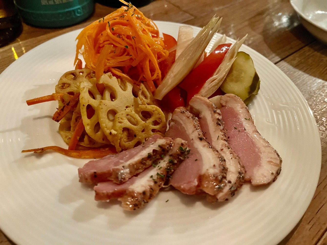 最初に、前菜盛り合わせ(1200円)をオーダー。この日は鴨のロースト、イタリアンきんぴら、自家製のピクルス、にんじんサラダです。にんにくと赤唐辛子で炒めたれんこんに白だしとカレー粉で味をつけたイタリアンきんぴらは、ふわりと香るにんにくとカレーの香りが絶妙!ほどよい酸味のピクルスは、野菜本来の味がしっかりと感じられる一品です。