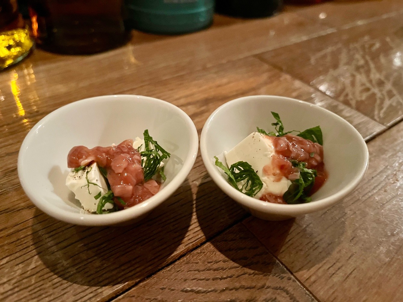 ワインにはチーズを合わせたいなあ、と思って、かつおの酒盗&クリームチーズ(400円)。酒盗の濃厚な旨味とまろやかなクリームチーズの相性は抜群!ちびちびつまみながらワインを飲む、ああ至福!