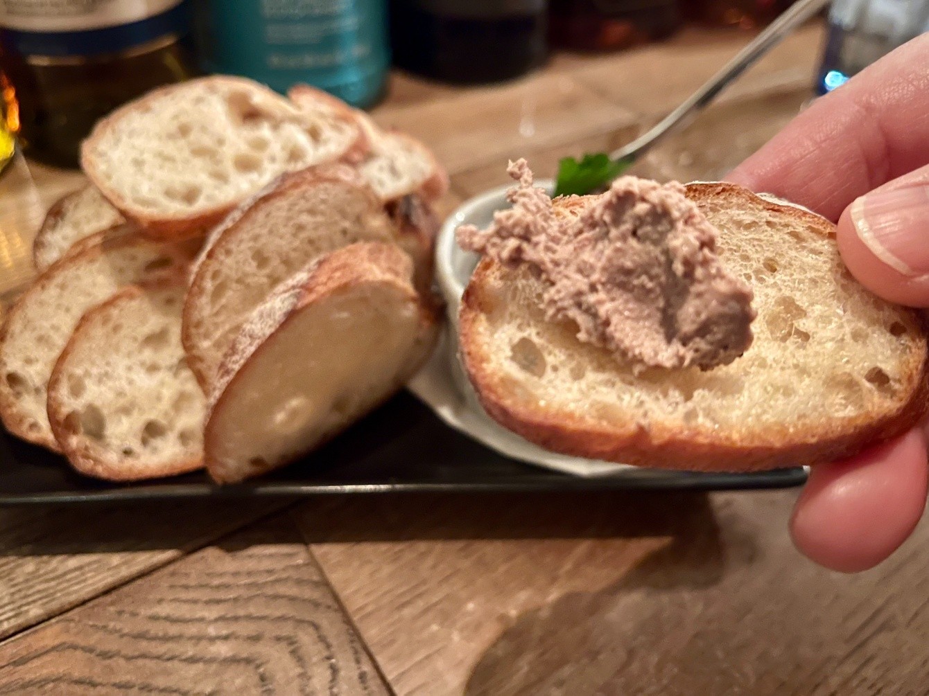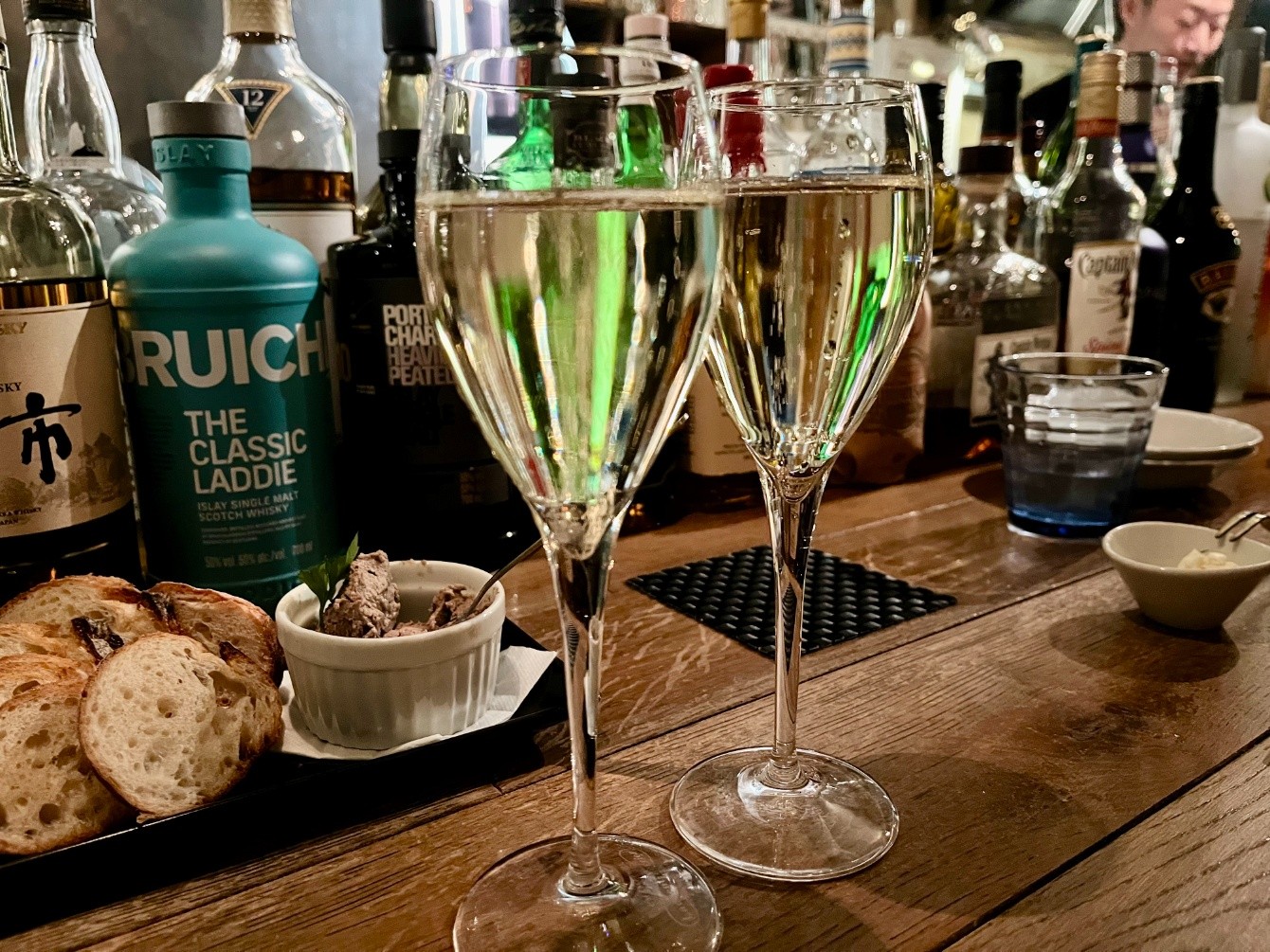 ワインのあとは、シュワッとスパークリングワイン(1杯900円)を頼みました。キリッと引き締まった甘味がレバーパテによく合います。