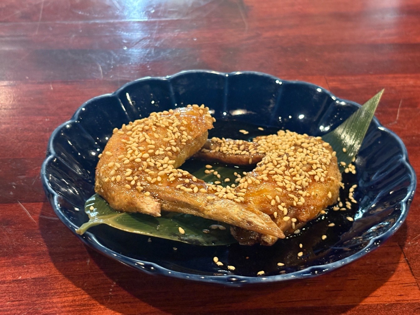 つまみがなくなってしまったので、料理を追加オーダー。女城主に合わせて、戦国つながりということで手羽先を選びました。三英傑手羽先と題し、織田信長、豊臣秀吉、徳川家康をそれぞれイメージした3種類がラインナップ。豊臣秀吉の手羽先(2本500円)は、派手好きな性格を金の胡麻で表現しているそうです。