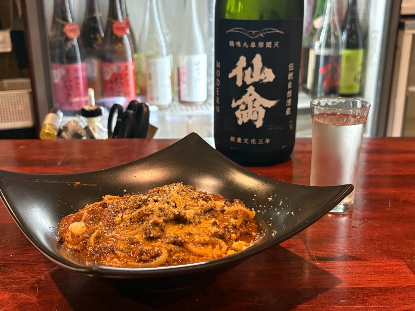 そろそろ1時間が経過し、いい感じに酔いが回ってきました。水ボトルも2本目が空きそうなので(笑)、今日は延長せず、次で終了にします。シメに注文した和牛ぼろねーぜ 生ぱすた(1480円)に合わせて、栃木県の仙禽 モダン 零式をチョイス。パンチのあるパスタに負けない、旨口の日本酒でした。