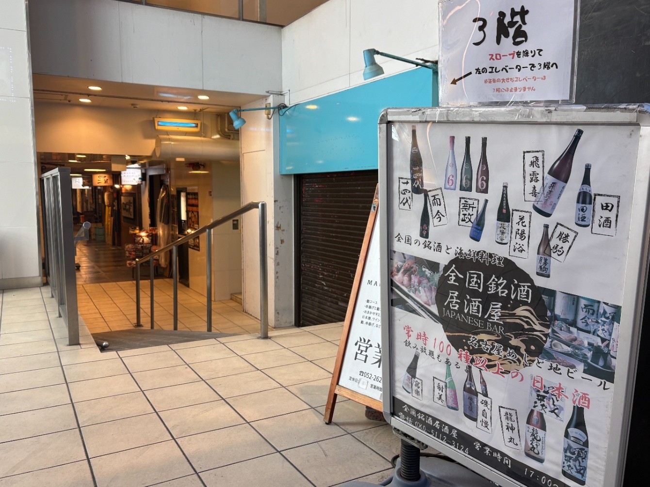 お店は、飲食店が集まったビルの3階にあります。周りには同じような飲食ビルがたくさんあって、とてもにぎやか。地図を見ながらきょろきょろしていると、日本酒がたくさんデザインされた看板を無事に発見できました。スロープを降りた先のエレベーターで3階に向かいます。