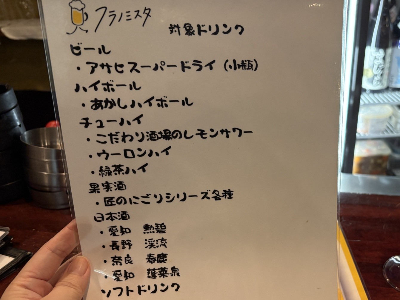 スタッフさんに「フラノミスタを使いたいんですが…」と伝えると、対象ドリンクのメニュー表を渡してくれました。そう、こちらはワンドリンクサービス「フラノミスタ」の対象店舗なんです。アルコールメニューはすべて660円以上のため、特別メニューで案内しているそうです。