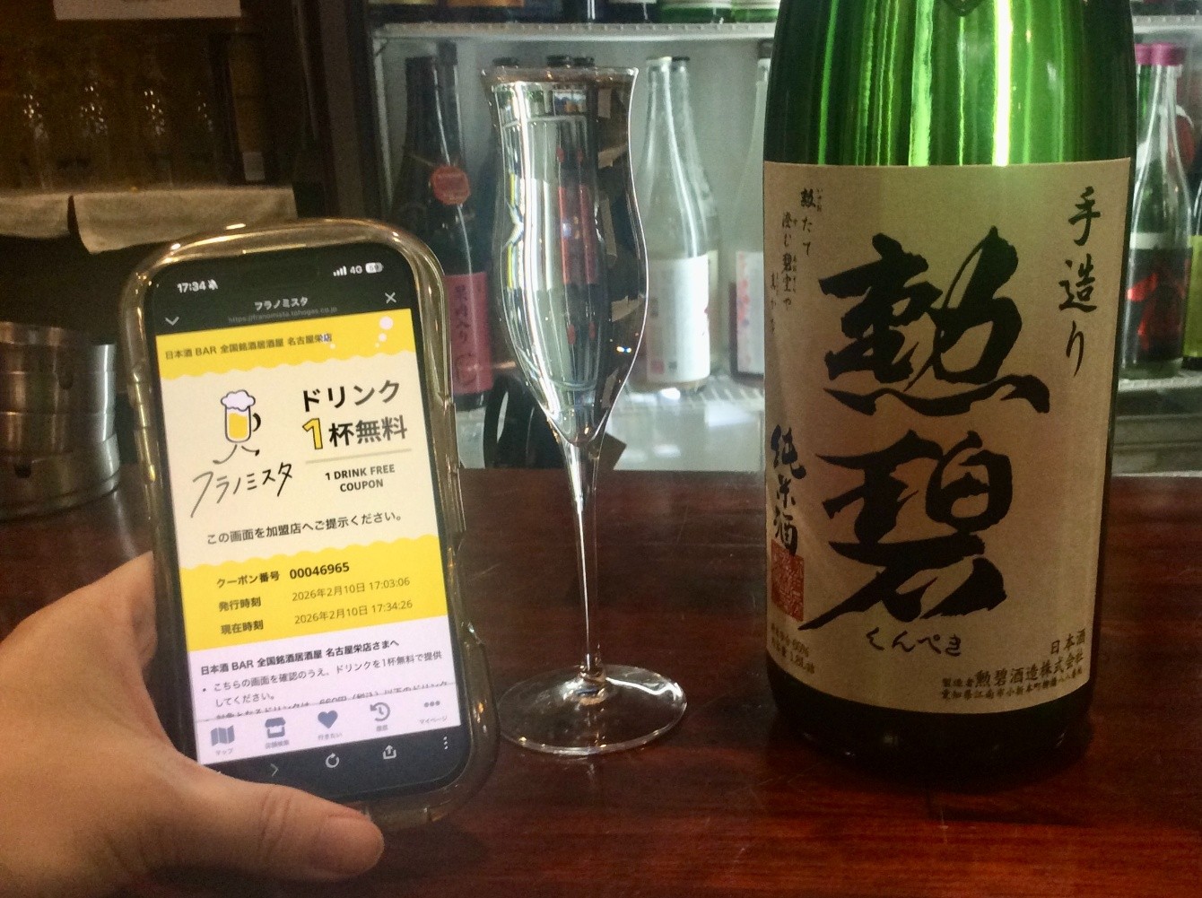 はい!ということで、まずは地元愛知県の勲碧 手造り純米酒からスタート。東海エリアではおなじみの人気銘柄で、淡麗な飲み口は最初の1杯に最適でした。