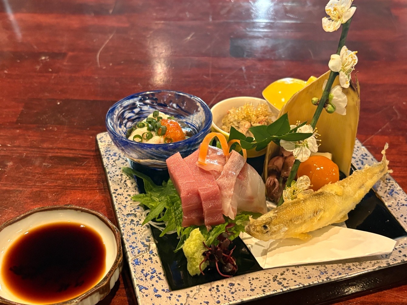 なにか日本酒にあうつまみがほしいと思いながらメニューをチェックしていると、ぴったりな一品を発見。本日の鮮魚と酒の肴 盛り合わせ(1680円)です。この日は本マグロ、マハチ、白子、紅ズワイガニと蟹みその共和え、ホタルイカと筍の酢味噌、ワカサギ天ぷら、キンカンのコンポート。内容がめちゃくちゃ豪華!しかも、日本酒との相性も間違いないヤツです。