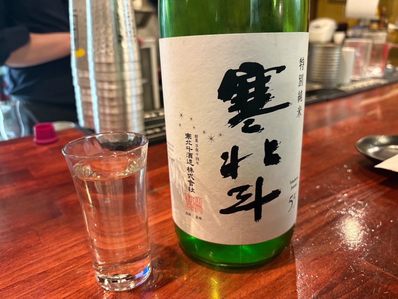 せっかく47都道府県の日本酒があるのだから、できるだけたくさんの銘柄を飲んでみたいもの。そんな人にぴったりのメニューが、銘酒の飲み放題です。1時間2200円と2750円の2種類があり、1時間経過後は30分700円の自動延長制。1人あたり2品以上の料理を注文すればOKです。さて、いくつの銘柄を飲めるのか⁉まずは、福岡県の寒北斗 特別純米55 吟醸スペック。食中酒にぴったりの味わいです。