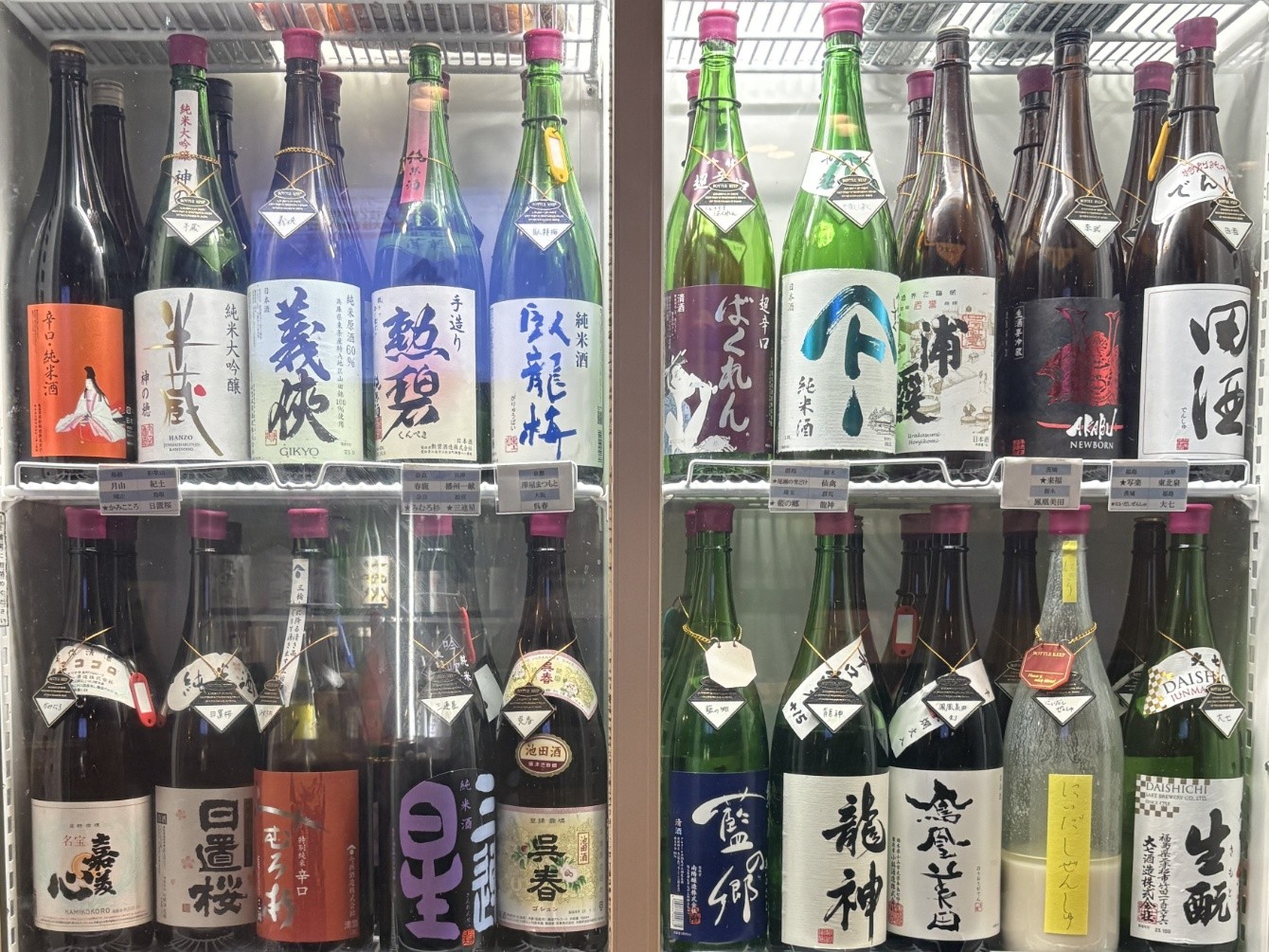 店内にある冷蔵庫のほとんどに一升瓶が入っていました。地域別に並んでいる冷蔵庫と、限定酒が並んでいる冷蔵庫があります。上の写真の右側は本州、左側は九州・沖縄の日本酒が入っていて、「間の通路は関門海峡に当たります」とスタッフさん。なるほど!